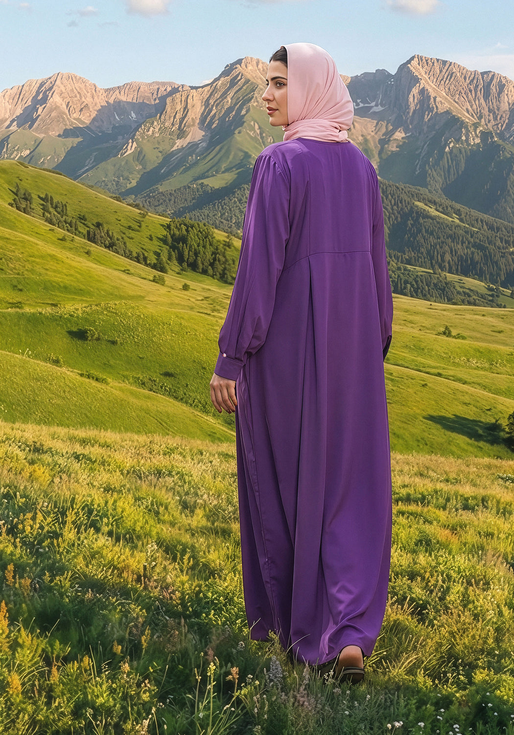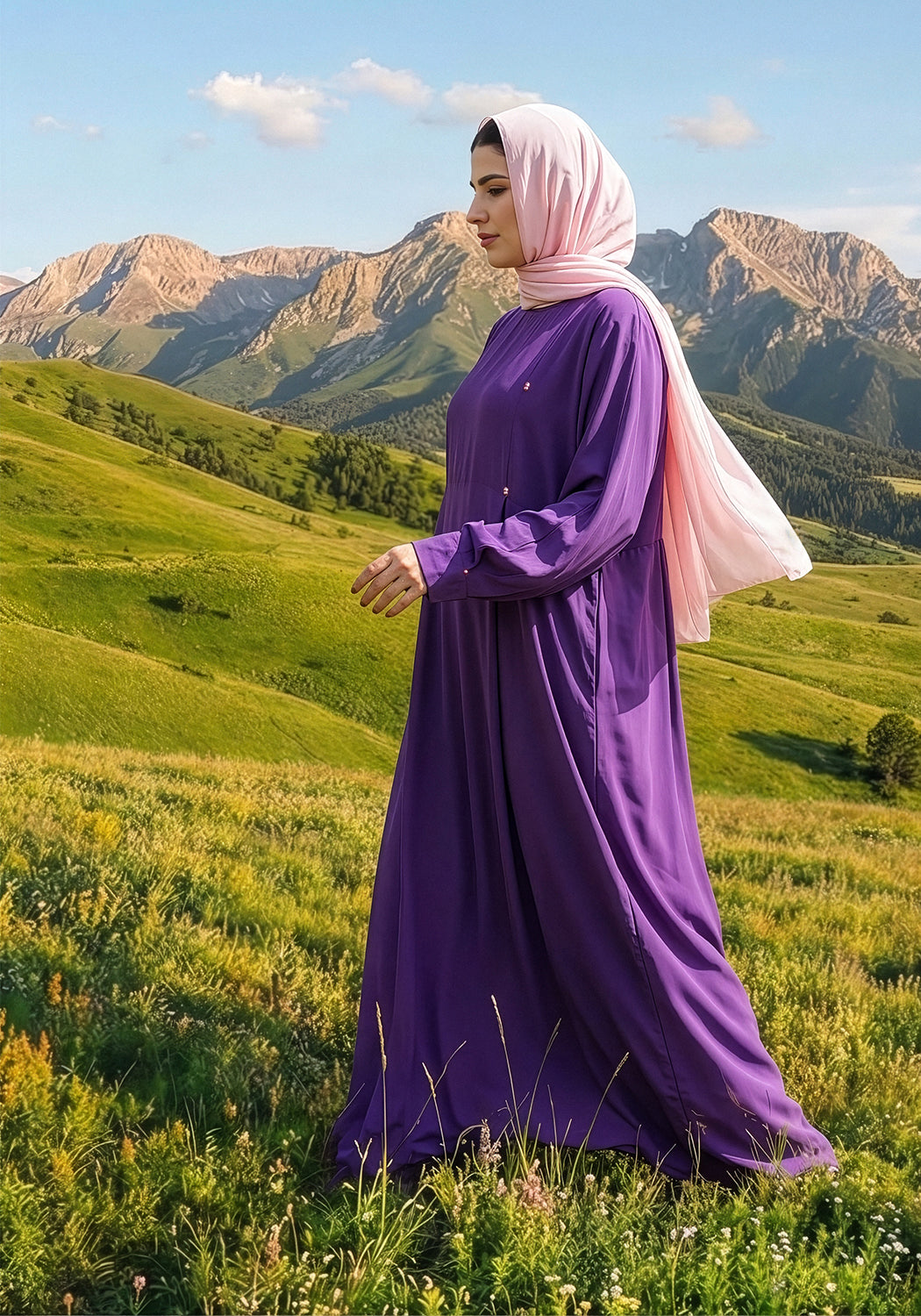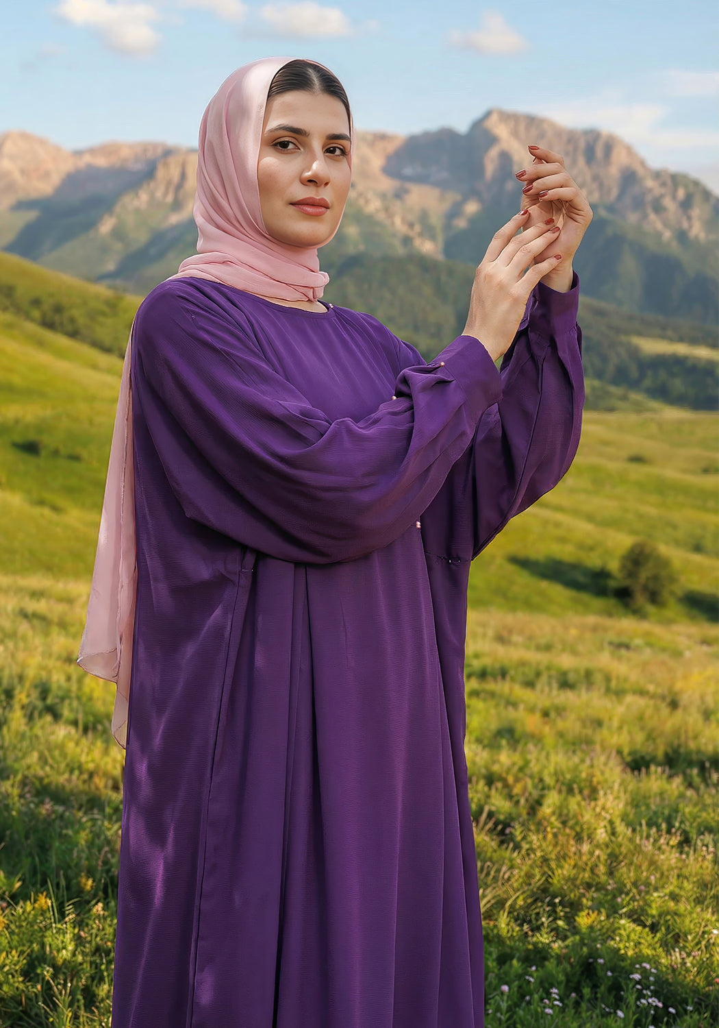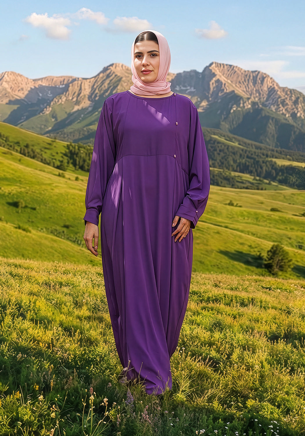 Add a touch of elegance to your wardrobe with our beautiful purple abaya, featuring box pleats on the front and sleeves and adorned with pink pearl buttons for a sophisticated accent. Complete with a contrasting pink scarf, this stylish abaya creates a polished, coordinated look perfect for casual outings and modest fashion.